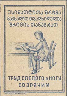 1931 г. Октябрь Разм. рамки 32,5 Х 48 мм. Одноцветная печать на белой бумаге. В прямоугольной рамке в центре слепой за столом. Внизу текст в две строки: «Труд слепого в ногу со зрячими». Сверху текст в три строки на грузинском языке. Слева внизу под рамкой выходные данные неразборчиво мелким шрифтом. На оборотной стороне оттиск треугольной фиолетовой печати с номиналом в центре и текстом: «Абсобес».