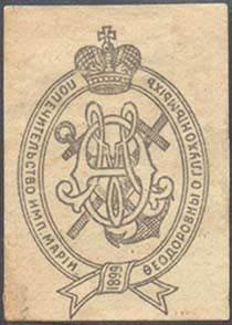 1912(?) г. Разм. 31 Х 43 мм. Одноцветная печать на желтоватой бумаге. В центре знак Попечительства Императрицы Марии Федоровны о глухонемых.