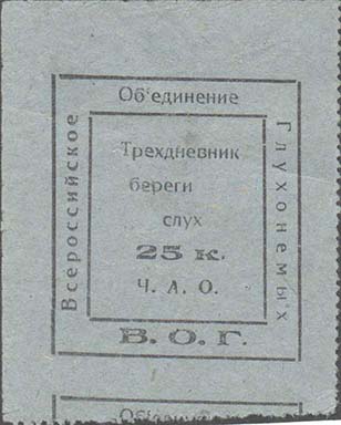 1932 г. Разм. 50 х 55 мм. Одноцветная печать на серо-синей бумаге. Нерегулярная зубц. В центре в двойной прямоугольной рамке текст в четыре строки: «Трехдневник «Береги слух» Ч.А.О.». В центре номинал. По периметру между рамками текст: «Всероссийское Объединение Глухонемых ВОГ».
