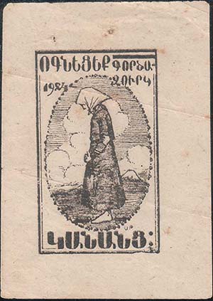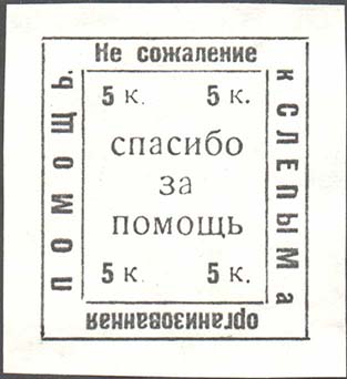 1925(?) г. Разм. 52 х 52 мм. В двойной прямоугольной рамке разм. 41 х 46 мм в центре текст в три строки: «Спасибо за помощь». По углам номинал. По периметру между рамками текст: «Не сожаление к слепым а организованная помощь».