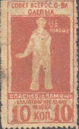 1932 г. Разм. 47 х 28 мм. Одноцветная печать на бумаге различных цветов. Зубц. 11 1/2. В прямо-угольной рамке текст в две строки: «На помощь слепым. «В ногу со зрячими»». Внизу номинал.