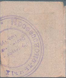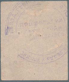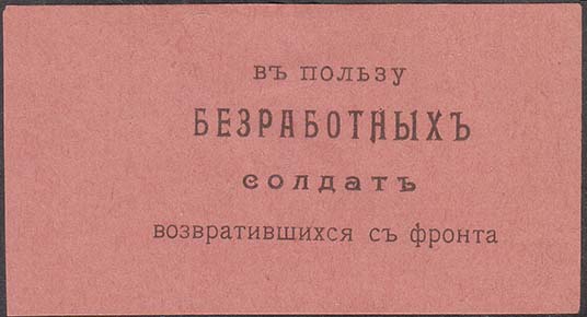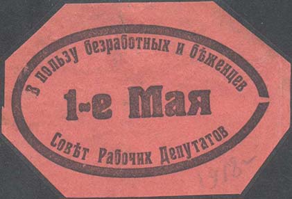 1918 г. Разм. 48 х 70 мм. Одноцветная печать на розовой бумаге. В центре в толстой овальной рамке с разрывом справа текст: «1-е Мая». По периметру рамки с внутренней стороне: «В пользу безработных и беженцев. Совет Рабочих Депутатов».