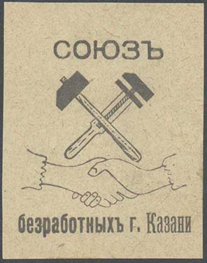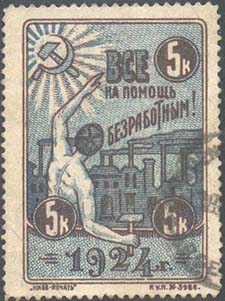 1924(?) г. Разм. рамки 29 х 43 мм. Одноцветная печать на белой (оттенки) бумаге. Зубц. 11 1/2. В прямоугольной рамке в центре рабочий протягивает руку безработному на фоне заводских корпусов и восходящего солнца с серпом и молотом в центре. Сверху текст: «Помощь безработному». По углам номинал.