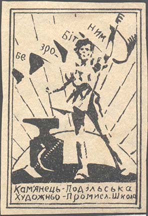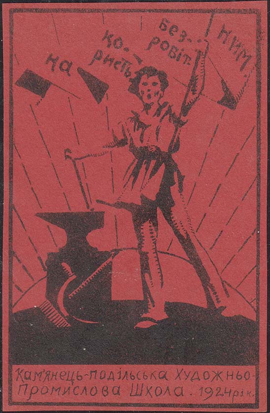 1924 г. Разм. рамки 50 х 72 мм. Одноцветная печать на бумаге различных цветов. В двойной прямоугольной рамке рабочий у наковальни со знаменем на фоне восходящего солнца. На знамени текст: «Безработным». Внизу текст в две строки на украинском языке: «Каменец-Подольская Художественно-Промыш[ленная]. школа».