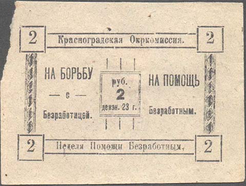 1923 г. Разм. 80 х 59 мм. Одноцветная печать на серо-желтой бумаге. В двойной прямоугольной рамке разм. 68 х 43 мм с номиналом в углах в центре в квадратной рамке номинал в дензнаках 1923 г. Слева текст в три строки: «На борьбу с безработицей». Справа текст в три строки: «На помощь безработным». Сверху между линиями рамки текст: «Красноградская окркомиссия». Внизу между линиями рамки текст: «Неделя помощи безработным».