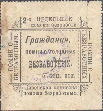 1924(?) г. Разм. 55 х 55 мм. Одноцветная печать на тонкой белой бумаге. Зубц. 11 1/2. В центре в прямоугольной рамке с декоративными элементами по углам текст в четыре строки: «Гражданин, помни о голодных безработных. 5 коп. зол.». Сверху над рамкой текст в две строки: «2-х недельник помощи безработным». Внизу под рамкой текст в две строки: «Ливенская комиссия помощи безработным». Слева и справа от рамки вертикально текст в две строки: «Помни о безработных». На лицевой стороне фиолетовый оттиск круглой печати с неразборчивым текстом.