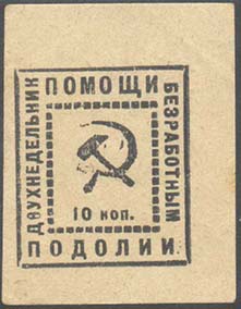 1924 г. Разм. рамки 26 х 31 мм. Одноцветная печать на бумаге различных цветов. В двойной прямоугольной рамке серп и молот, внизу номинал. По периметру между рамками текст: «Двухнедельник помощи безработным Подолии».