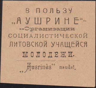 1917(?) г. Разм. 54 х 48 мм. Одноцветная печать на желтовато-серой бумаге. В центре текст в шесть строк: «В пользу «Аушрине» - Организации социалистической литовской учащейся молодежи». Ниже декоративный элемент в виде горизонтальных линий. Внизу текст на литовском языке.