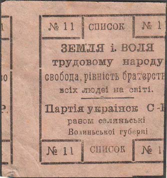1917 г. Разм. рамки 46 х 50 мм. Одноцветная печать на тонкой серой бумаге. В прямоугольной рамке сверху текст на украинском языке в четыре строки: «Земля и воля трудовому народу. Свобода, равенство братство всех людей на свете». Внизу текст на украинском языке в три строки: «Партия украинск[их]. С-Р Волынской губернии». По углам в прямоугольной рамке номер списка: «№11». Сверху и снизу текст: «Список».