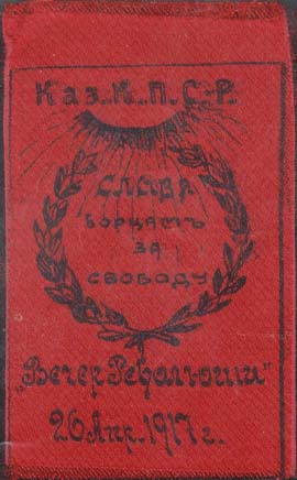 Разм. рамки 42,5 х 64 мм. В центре в венке текст в четыре строки: «Слава борцам за свободу». Сверху солнце с лучами вниз. Сверху аббревиатура: «Каз[анский]. К.П.С.-Р.». Внизу текст в две строки: ««Вечер Революции» 26 Апр[еля]. 1917 г.».