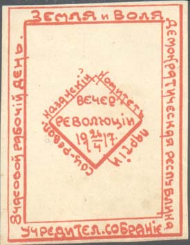 Разм. рамки 42,5 х 57 мм. В центре в рамке в форме ромба текст в три строки: «Вечер революции 19 26/4 17 г.». По периметру ромба текст: «Казанский Комитет партии соц[иалистов].-револ[юционеров].». По периметру между рамками текст: «Земля и воля. Демократическая республика. Учредител[ьное]. Собрание. 8 часовой рабочий день».
