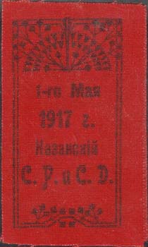 1917 г. 01.05.1917 г. Разм. 33 х 60 мм. Одноцветная печать на толстой материи различных цветов. В центре текст в четыре строки: «1-го Мая 1917 г. Казанский С.Р. и С.Д.». В двойной прямоугольной декоративной рамке сверху и снизу орнамент.