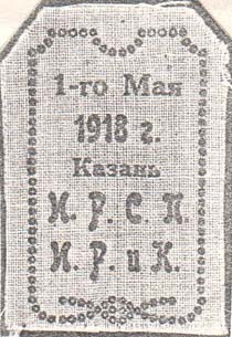 1918 г. 01.05.1918 г. Разм. 33 х 50 мм. Одноцветная печать на толстой розовой материи. В декоративной рамке в центре текст в пять строк: «1-го Мая 1918 г. Казань К.Р. С.П.К.Р. и К.».