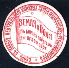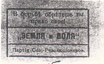 1917 г. Разм. 58 х 38 мм. Одноцветная печать на светло-розовой бумаге. В центре прямоугольной рамке разм. 47 х 27 мм в центре текст: ««Земля и воля»». Сверху текст в две строки: «В борьбе обретешь ты право свое!». Внизу текст: «Партия социалистов-Революционеров».