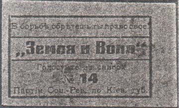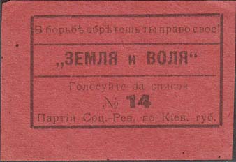 1917 г. Разм. 57 х 38 мм. Одноцветная печать на темно-розовой бумаге. В центре прямоугольной рамке разм. 47 х 27 мм в центре текст: ««Земля и воля»». Сверху текст: «В борьбе обретешь ты право свое!». Внизу текст в три строки: «Голосуйте за список №14 Партии Соц[иалистов].-Рев[олюционеров]. По Ки-ев[ской]. Губ[ернии].».