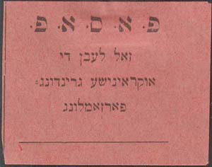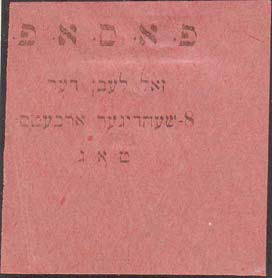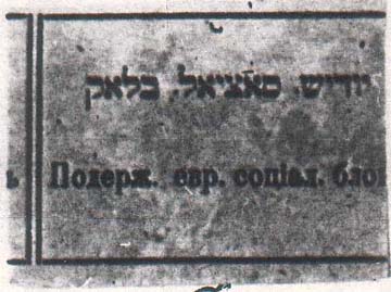 1917 г. Разм. Рамки 54 х 35 мм. Одноцветная печать на бумаге различных цветов. В прямоугольной рамке сверху текст на иврите. Внизу текст: «Поддерж[им]. Евр[ейский]. Социал[истический]. блок».