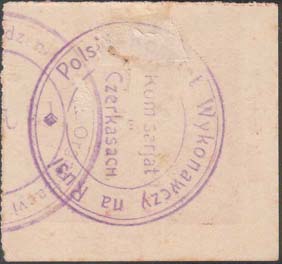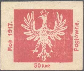 1917 г. Одноцветная печать на желтоватой бумаге. На лицевой стороне в центре на сплошном прямоугольнике разм. 34 х 30 мм герб Польши – одноглавый орел.
