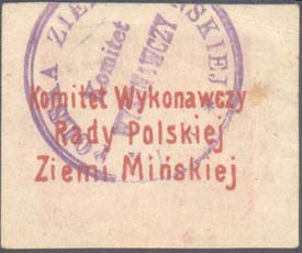 Разм. 46 х 32 мм. На оборотной стороне текст в три строки на польском языке: «Исполнительный комитет польского совета Минской области» и фиолетовый оттиск круглой печати диаметром 34 мм с текстом на польском языке.
