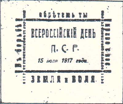 1917 г. 15.07.1917 г. Одноцветная печать на желтоватой бумаге. В прямоугольной декоративной рамке разм. 45 х 30 мм текст в три строки: «Всероссийский день П. С-Р. 15 июля 1917 г.». По наружному периметру рамки текст: «В борьбе обретешь ты право свое. Земля и воля».