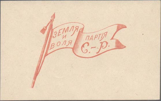 1917 г. 16.07.1917 г. Разм. 94 х 58 мм. Одноцветная печать на кремовой бумаге. В центре знамя с древком. На полотнище знамени текст в три строки: «Земля и воля Партия С.-Р.».