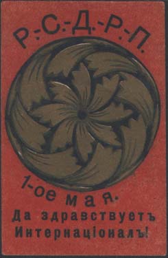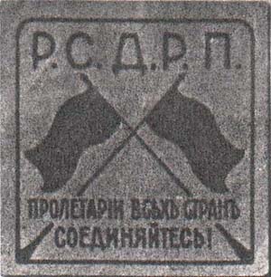 1917 г. Разм. рамки 41 х 42 мм. Одноцветная печать на желтоватой бумаге. В прямоугольной рамке с за-кругленными краями в центре два скрещенных флага. Сверху аббревиатура: «Р.С.Д.Р.П.». Внизу текст в две строки: «Пролетарии всех стран, соединяйтесь!».