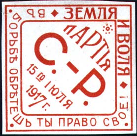 1917 г. Разм. 30 х 35 мм. Одноцветная печать на розово-серой бумаге низкого качества. В центре текст в три строки: «Партия социалистов революционеров». Сверху текст в две строки: «Земля и воля» и две горизонтальных черты.