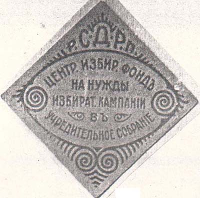 1917 г. Ромб разм. 68 х 68 мм. Одноцветная печать на желтоватой бумаге. В центре в овальной декора-тивной рамке текст в пять строк: «Центр[альный]. Избир[ательный]. Фонд. На нужды избират[ельной]. компании в Учредительное Собрание». Сверху аббревиатура: «РСДРП».
