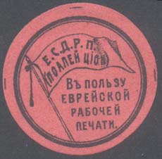 1917 г. 11.07.1917 г. Круг диаметром 37 мм. Одноцветная печать на розовой бумаге. В центре в двойной круглой рамке диаметром 32 мм флаг с древком. На полотнище текст в две строки: «Е.Р.С.Д.Р.П. (Поалей Цион)». Внизу текст в четыре строки: «В пользу еврейской рабочей печати».
