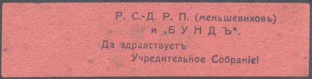 1917 г. 17.12.1917 г. Разм. 104 х 26 мм. Одноцветная печать на розовой бумаге. В центре текст в четыре строки: «Р.С.-Д.Р.П. (меньшевиков) и «БУНД». Да здравствует Учредительное Собрание!».