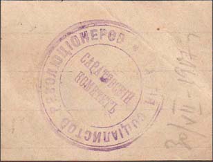 1917 г. 30.08.1917 г. 1917 г. (30.08.1917 г.). Разм. 52 х 39 мм. Одноцветная печать на тетрадной бумаге в линейку. На лицевой стороне фиолетовый оттиск круглой печати диаметром 32 мм. На печати в центре текст в две строки: «Саратовский комитет». По окружности между рамками текст: «Партия Социалистов - Революционеров».