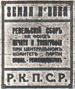 1917 г. Разм. 41 х 48 мм. Одноцветная печать на толстой желтоватой бумаге. В прямоугольной рамке с декоративными элементами по углам в центре текст в шесть строк: «Ревельский сбор на фонд печати и типографии при центральном Комитете партии Социал[истов]. революционеров». Сверху в отдельной рамке текст: «Земля и воля». Внизу в отдельной рамке аббревиатура «Р.К.П.С.Р.».