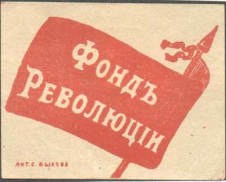 1917 г. Разм. 54 х 43 мм. Одноцветная печать на желтоватой бумаге. В центре красный флаг с древ-ком. На полотнище флага текст в две строки: «Фонд революции». Слева внизу выходные данные мелким шрифтом: «Лит. С.Быхова».