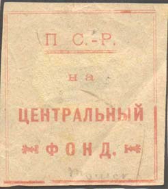 1917 г. Разм. рамки 37,5 х 42 мм. Одноцветная печать на тонкой желтоватой бумаге. В двойной прямо-угольной рамке сверху аббревиатура П.С.-Р. с подчеркиванием. Ниже текст в три строки: «На центральный фонд» и декоративные элементы.