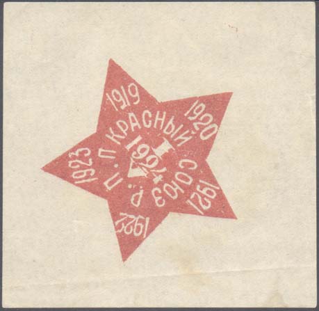1924 г. Разм. 74 х 76 мм. Одноцветная печать на белой бумаге. В центре пятиконечная звезда с датами на лучах: «1920, 1921, 1922, 1923». В центре дата I/V1924. По окружности текст: «Красный союз Р.П.П».