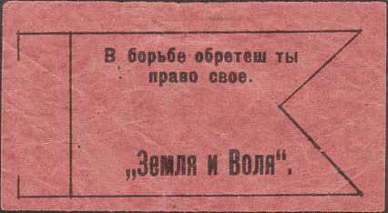 1917(?) г. Разм. 71 х 39 мм. Одноцветная печать на тонкой розовой бумаге. В рамке сложной формы в виде флажка сверху текст в две строки: «В борьбе обретешь ты право свое». Внизу текст: ««Земля и Воля»».