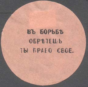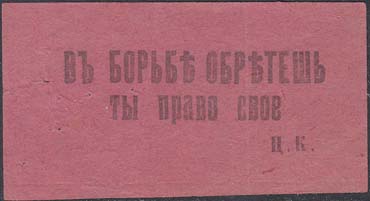 1917(?) г. Разм. 62 х 33 мм. Одноцветная печать на тонкой розово-серой бумаге. В центре текст в три строки: «В борьбе обретешь ты право свое. Ц.К.».