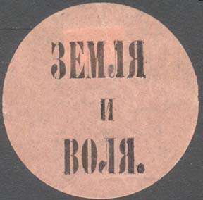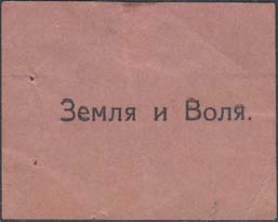 1917(?) г. Разм. 43 х 33 мм. Одноцветная печать на розово-серой бумаге. В центре текст: «Земля и Воля».