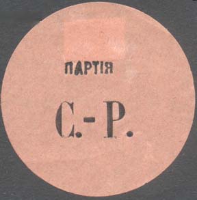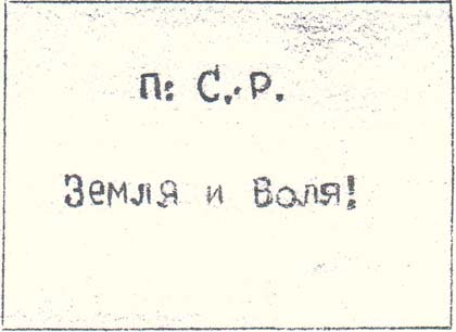 1917(?) г. Разм. 66 х 49 мм. Одноцветная печать на тонкой темно-вишневой глянцевой бумаге. В центре текст в две строки: «П. С.-Р. Земля и Воля!».
