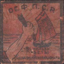 1917(?) г. Разм. 36 х 36 мм. Двухцветная печать на толстой желтоватой бумаге. В прямоугольной рамке в центре аллегорический рисунок: на фоне лучей восходящего солнца по морю плывет лодка с парусами из газеты и рука с факелом. Сверху полукругом аббревиатура: «О.Г.Ф. П.С.Р.». Внизу текст в три строки: «В пользу газеты Социалист-Революционер».