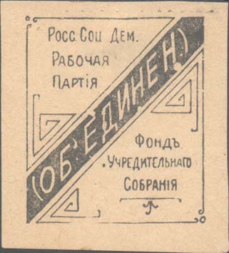 1917 г. Разм. 54 х 59 мм. Одноцветная печать на серо-желтой бумаге. В центре в прямоугольной рамке разм. 42 х 49 мм в левом верхнем углу текст в три строки: «Росс[ийская]. Соц[иал]. Дем[ократическая]. Рабочая Партия». По диагонали слева направо снизу вверх текст: «Объединен[ая].». В правом нижнем углу текст в три строки: «Фонд учредительного Собрания».