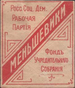 1917 г. Разм. 54 х 59 мм. Одноцветная печать на серо-желтой бумаге. В центре в прямоугольной рамке разм. 42 х 49 мм в левом верхнем углу текст в три строки: «Росс[ийская]. Соц[иалистическая]. Дем[ократическая]. Рабочая Партия». По диагонали слева направо снизу вверх текст: «Меньшевики». В правом нижнем углу текст в три строки: «Фонд учредительного Собрания».