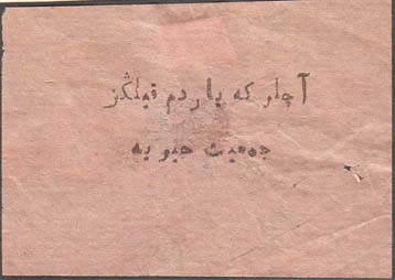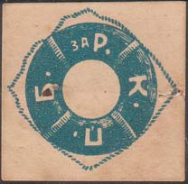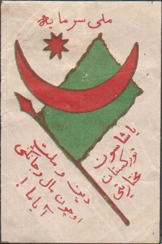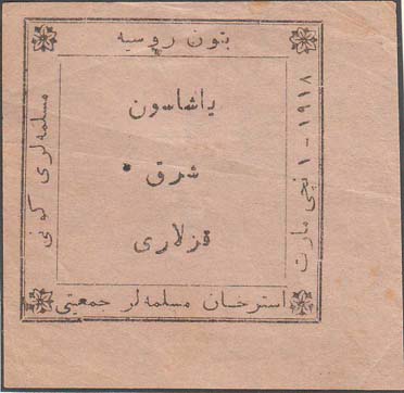 1917 г. Разм. 55 х 82 мм. Двухцветная печать на тонкой белой бумаге. В центре зеленое знамя и полумесяц. В левом верхнем углу многолучевая звезда. Сверху текст на татарском языке арабским шрифтом. Внизу слева текст в три строки на татарском языке арабским шрифтом. Внизу справа текст в три строки на татарском языке арабским шрифтом.