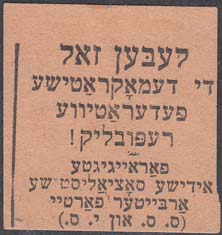 1917(?) г. Разм. 39 х 38 мм. Одноцветная печать на розово-серой бумаге. В центре текст в семь строк на идиш.