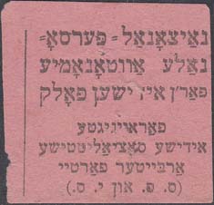 1917(?) г. Разм. 39 х 37 мм. Одноцветная печать на розово-серой бумаге. В центре текст в шесть строк на идиш.