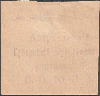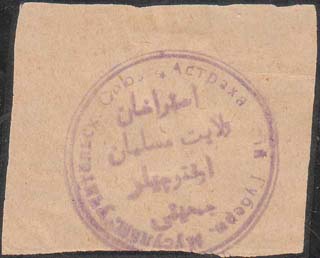 1917 г. Разм. 50 х 42 мм. Одноцветная печать на кремовой бумаге. В центре фиолетовый оттиск круглой печати союза диаметром 36 мм. На печати в двойной круглой рамке текст в четыре строки на татарском языке арабским шрифтом. По внутреннему периметру рамки текст: «Астраханский Губерн[ский]. Мусульман[ский]. учительский Союз».