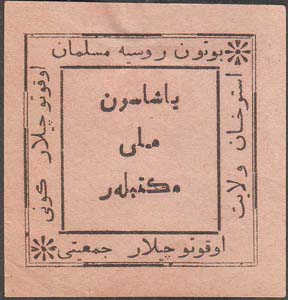 1917 г. Разм. рмки 39 х 39 мм. Одноцветная печать на бумаге различных цветов. В двойной прямоугольной рамке в центре текст в три строки на татарском языке арабским шрифтом: «В пользу национальных школ». По периметру между рамками текст на татарском языке арабским шрифтом.