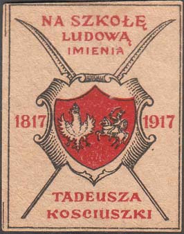 1917 г. Разм. рамки 42 х 55 мм. Двухцветная печать на толстой желтоватой бумаге. В прямоугольной рамке в центре картуш на фоне скрещенных пик. На картуше в декоративной рамке гербы Польши и Литвы. Слева дата: «1817». Справа дата: «1917». Сверху текст в три строки на польском языке: «На народную школу имени». Внизу продолжение текста на польском языке в две строки: «Тадеуша Косцюшко». По углам знака разграничительные линии.