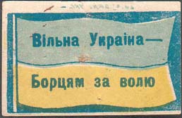 1917 г. Разм. 44 х 28 мм. Трехцветная печать на белой бумаге. В центре на сплошном фоне флаг Украины с древком. На полотнище флага текст на украинском языке в две строки: «Вольная Украина – Борцам за волю».