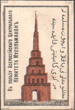 1917 г. Разм. 40 х 60 мм. Двухцветная печать на белой бумаге. В двойной прямоугольной рамке разм. 35,5 х 54 мм в центре ступенчатая башня с полумесяцем на шпиле. Слева текст вертикально в две строки: «В пользу Всероссийского Центрального Комитета Мусульманок». Справа вертикально текст в две строки на татарском языке арабским шрифтом. По углам знака разграничительные линии.