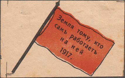 1917 г. Разм. 71 х 45 мм. Двухцветная печать на сероватой бумаге. В центре красное знамя. На полотнище знамени текст в четыре строки: «Земля тому, кто сам работает на ней. 1917». По углам знака разграничительные линии.